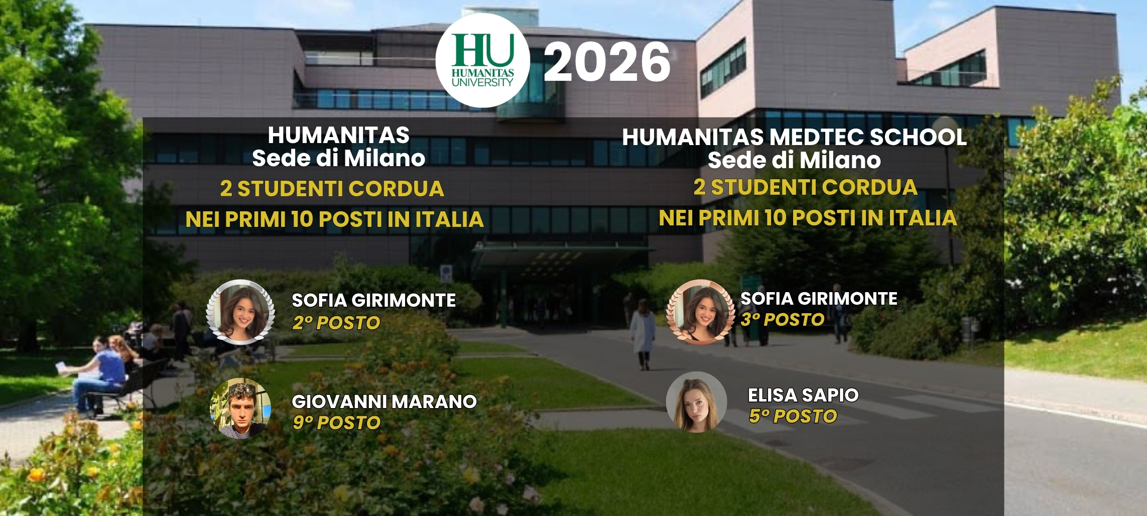 I risultati conseguiti dai nostri studenti nelle graduatorie di Medicina e Chirurgia e di Medicina percorso Medtec, entrambe in lingua inglese, dell’Humanitas University rappresentano molto più di un traguardo personale: sono la testimonianza concreta di un percorso costruito con rigore, metodo e visione, in cui ogni passo è orientato al raggiungimento dell’eccellenza.